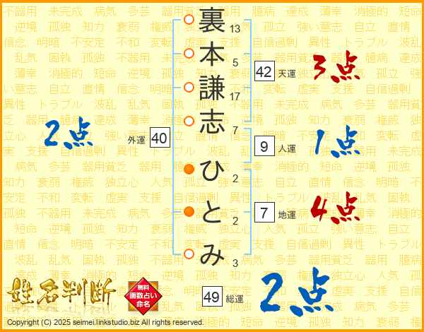 裏本謙志ひとみさんの総運は49画の2点!