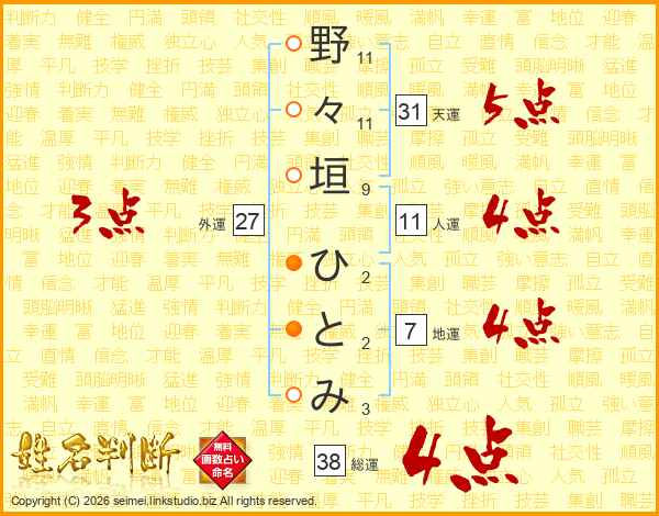 野(11画)々(11画)垣(9画) ひ(2画)と(2画)み(3画)