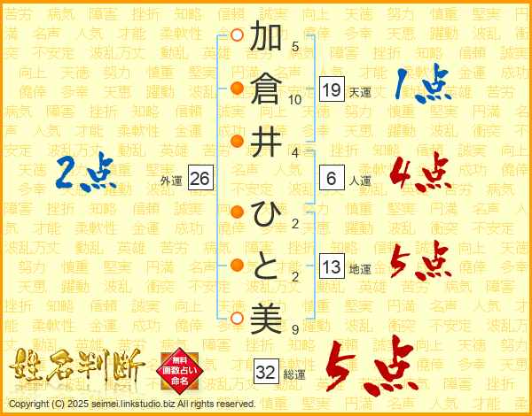 加倉井ひと美さんの総運は32画の5点!