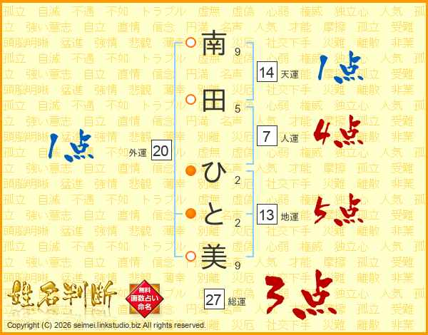 南田ひと美さんの総運は27画の3点!