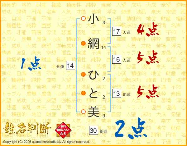 小(3画)網(14画) ひ(2画)と(2画)美(9画)