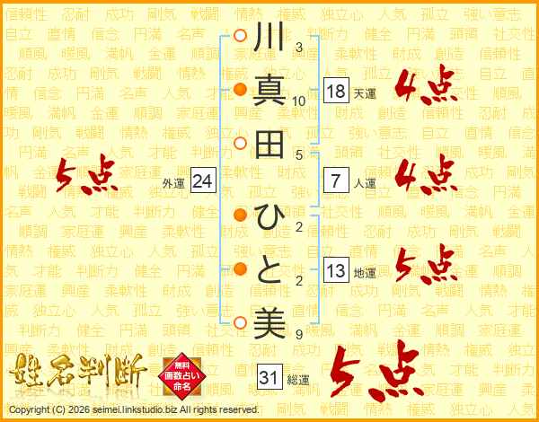 川(3画)真(10画)田(5画) ひ(2画)と(2画)美(9画)