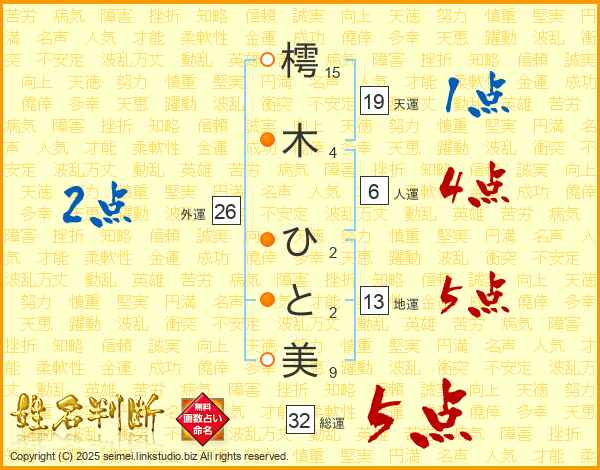 樗(15画)木(4画) ひ(2画)と(2画)美(9画)