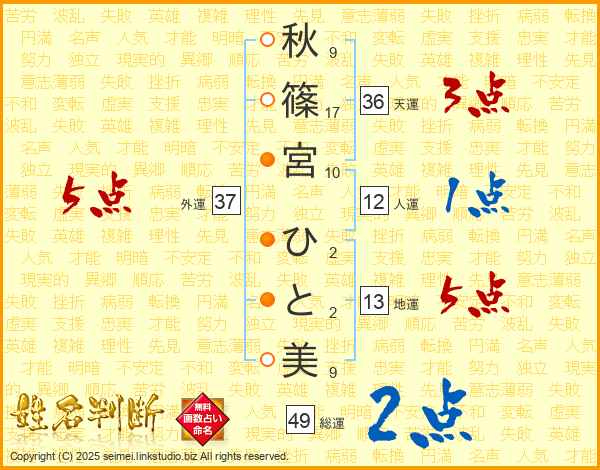 秋(9画)篠(17画)宮(10画) ひ(2画)と(2画)美(9画)