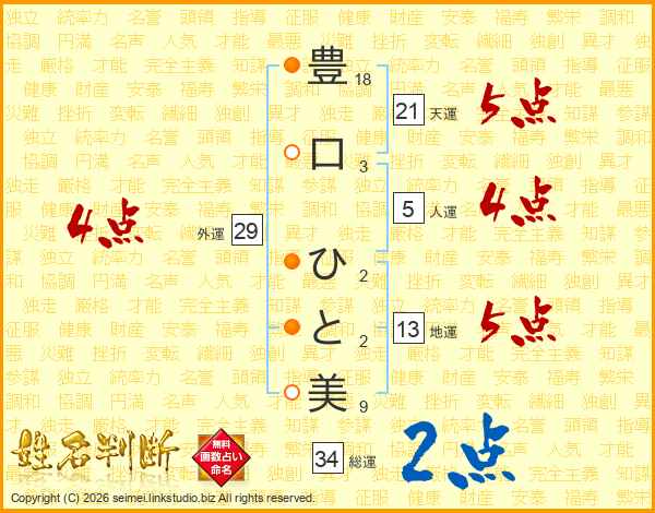 豊口ひと美さんの総運は34画の2点!