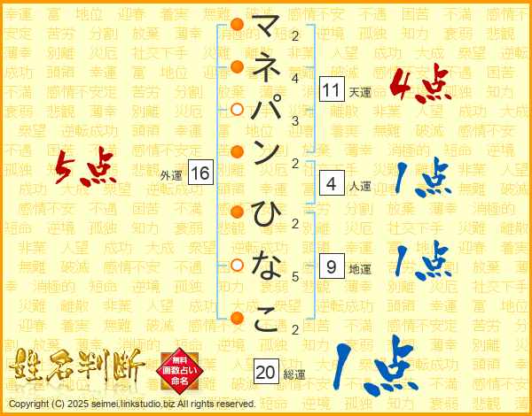 生活面を象徴する運勢です。外部から受ける影響力を表し、結婚運、家庭運や職場、環境への順応性を表します。総運から人運を引いた画数。姓や名が1文字の場合を除く。