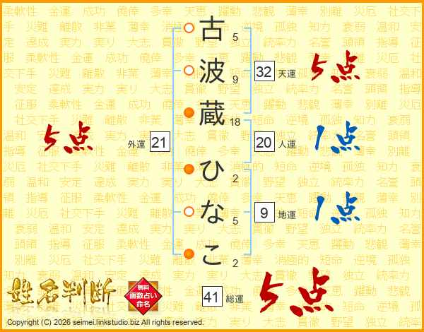 古(5画)波(9画)蔵(18画) ひ(2画)な(5画)こ(2画)