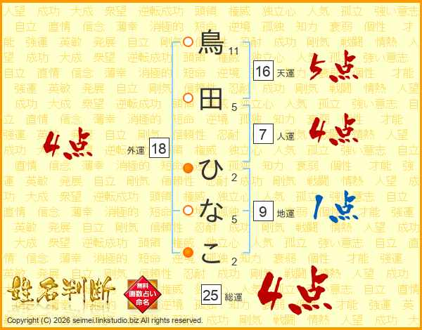 鳥(11画)田(5画) ひ(2画)な(5画)こ(2画)