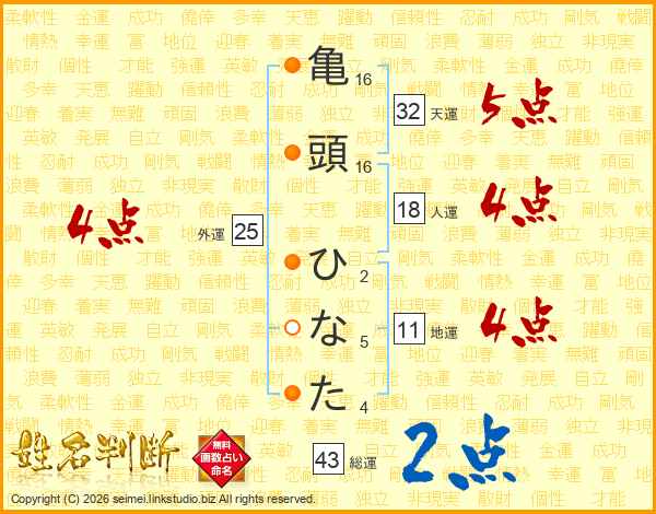 亀(16画)頭(16画) ひ(2画)な(5画)た(4画)