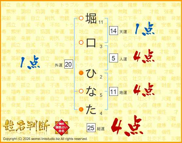 堀(11画)口(3画) ひ(2画)な(5画)た(4画)
