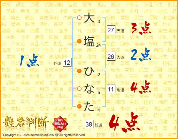 大塩ひなたさんの総運は38画の4点!