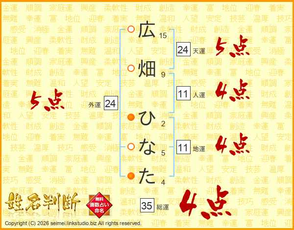 生活面を象徴する運勢です。外部から受ける影響力を表し、結婚運、家庭運や職場、環境への順応性を表します。総運から人運を引いた画数。姓や名が1文字の場合を除く。
