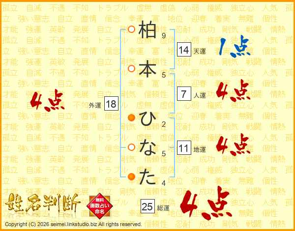 生活面を象徴する運勢です。外部から受ける影響力を表し、結婚運、家庭運や職場、環境への順応性を表します。総運から人運を引いた画数。姓や名が1文字の場合を除く。