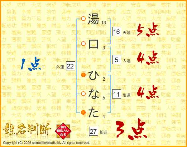 湯(13画)口(3画) ひ(2画)な(5画)た(4画)