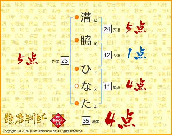生活面を象徴する運勢です。外部から受ける影響力を表し、結婚運、家庭運や職場、環境への順応性を表します。総運から人運を引いた画数。姓や名が1文字の場合を除く。