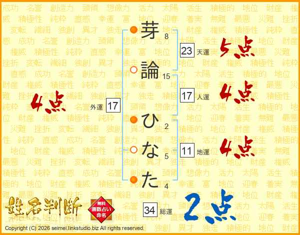 芽(8画)論(15画) ひ(2画)な(5画)た(4画)