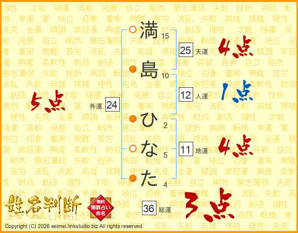 満(15画)島(10画) ひ(2画)な(5画)た(4画)