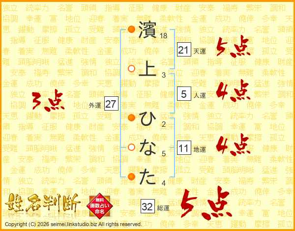 濱(18画)上(3画) ひ(2画)な(5画)た(4画)