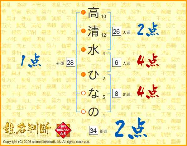 高(10画)清(12画)水(4画) ひ(2画)な(5画)の(1画)