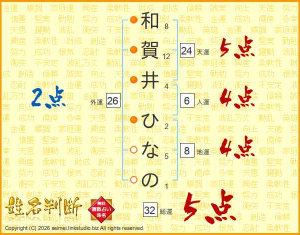 和賀井ひなのさんの総運は32画の5点!