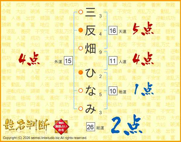 三(3画)反(4画)畑(9画) ひ(2画)な(5画)み(3画)