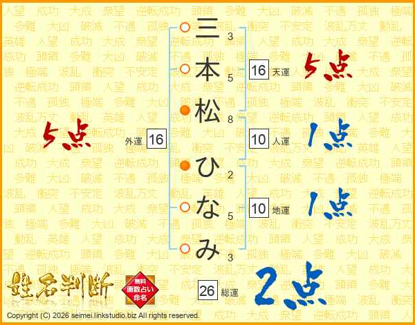 あなたの人生を表す1番重要な運勢です。生涯を通じて影響する総合運となり、主に50歳以降の晩年期に影響を及ぼします。苗字と名前の合計画数。