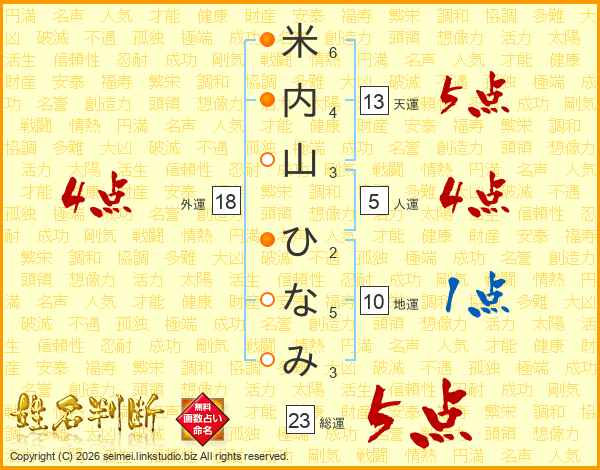 米(6画)内(4画)山(3画) ひ(2画)な(5画)み(3画)