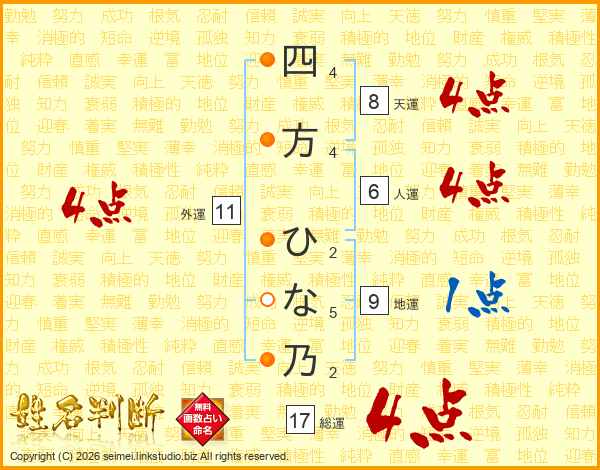 四(4画)方(4画) ひ(2画)な(5画)乃(2画)