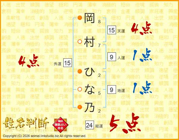 岡(8画)村(7画) ひ(2画)な(5画)乃(2画)