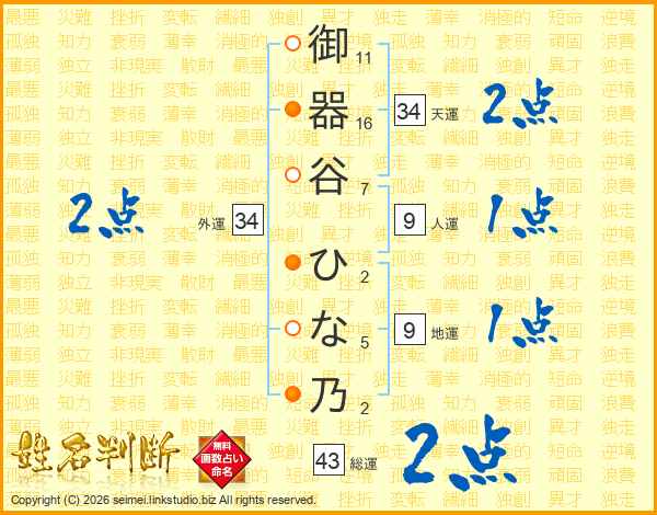 御(11画)器(16画)谷(7画) ひ(2画)な(5画)乃(2画)