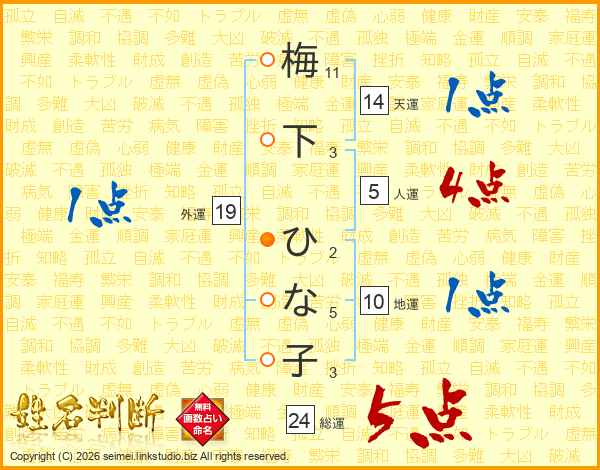 梅(11画)下(3画) ひ(2画)な(5画)子(3画)