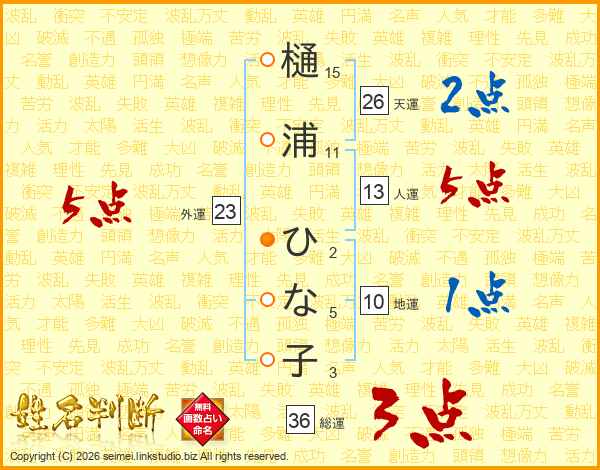 樋(15画)浦(11画) ひ(2画)な(5画)子(3画)