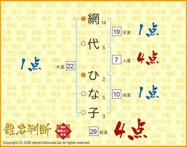 網代ひな子さんの総運は29画の4点!