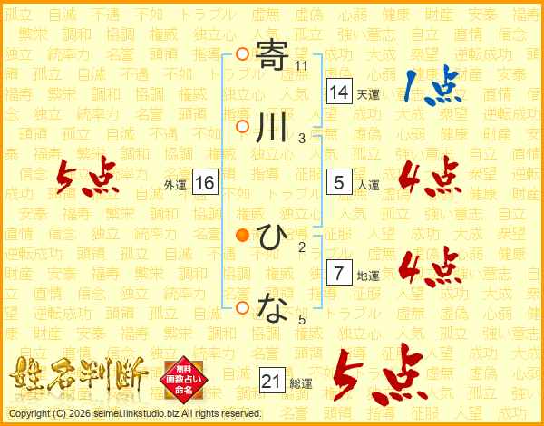 生活面を象徴する運勢です。外部から受ける影響力を表し、結婚運、家庭運や職場、環境への順応性を表します。総運から人運を引いた画数。姓や名が1文字の場合を除く。