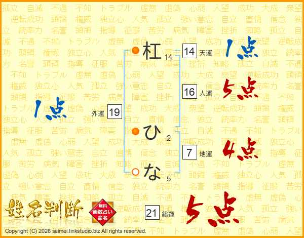 生活面を象徴する運勢です。外部から受ける影響力を表し、結婚運、家庭運や職場、環境への順応性を表します。総運から人運を引いた画数。姓や名が1文字の場合を除く。