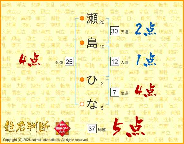 瀬(20画)島(10画) ひ(2画)な(5画)