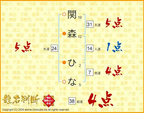 生活面を象徴する運勢です。外部から受ける影響力を表し、結婚運、家庭運や職場、環境への順応性を表します。総運から人運を引いた画数。姓や名が1文字の場合を除く。