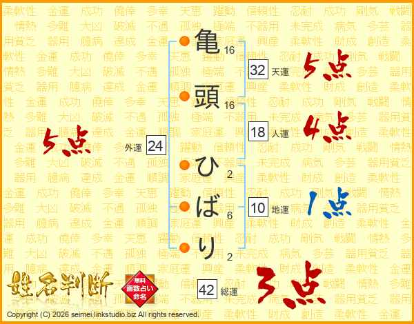 亀(16画)頭(16画) ひ(2画)ば(6画)り(2画)