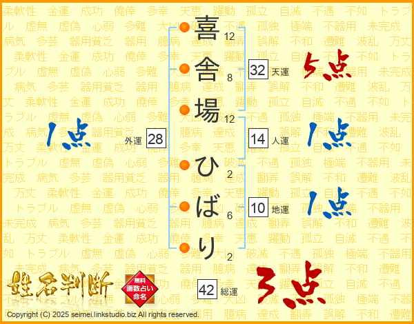 喜(12画)舎(8画)場(12画) ひ(2画)ば(6画)り(2画)
