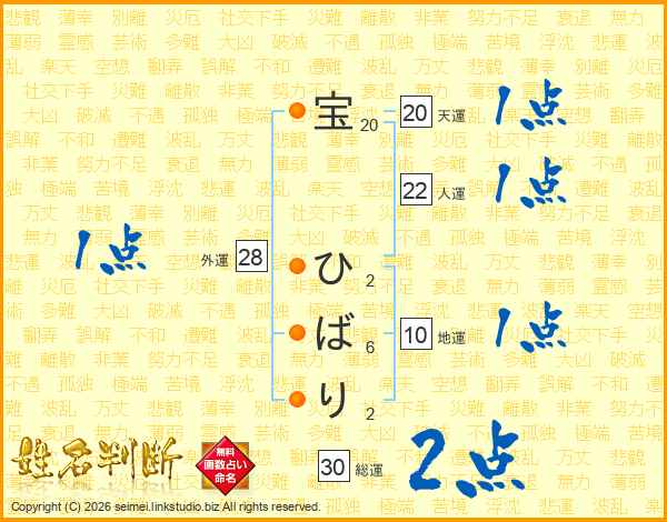 宝(20画) ひ(2画)ば(6画)り(2画)