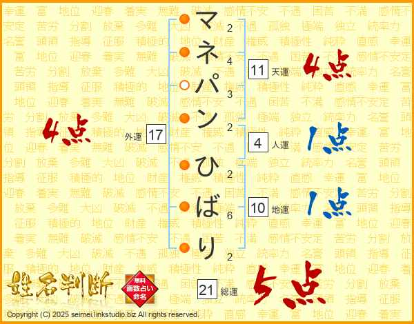生活面を象徴する運勢です。外部から受ける影響力を表し、結婚運、家庭運や職場、環境への順応性を表します。総運から人運を引いた画数。姓や名が1文字の場合を除く。