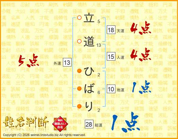 立(5画)道(13画) ひ(2画)ば(6画)り(2画)
