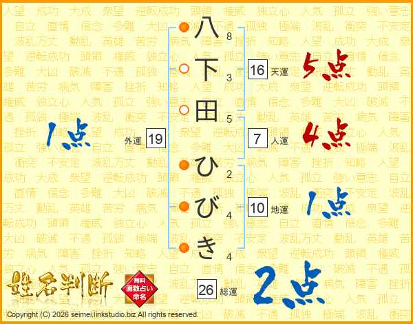 八下田ひびきさんの総運は26画の2点!