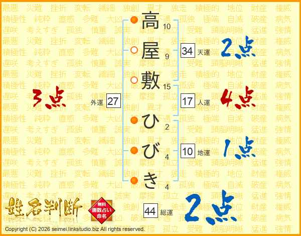 高(10画)屋(9画)敷(15画) ひ(2画)び(4画)き(4画)