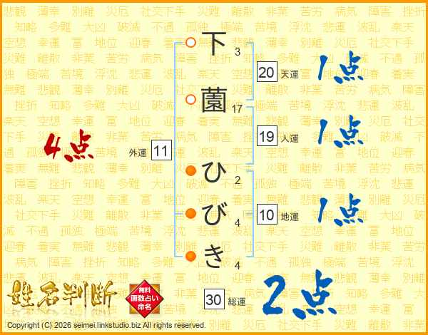 生活面を象徴する運勢です。外部から受ける影響力を表し、結婚運、家庭運や職場、環境への順応性を表します。総運から人運を引いた画数。姓や名が1文字の場合を除く。