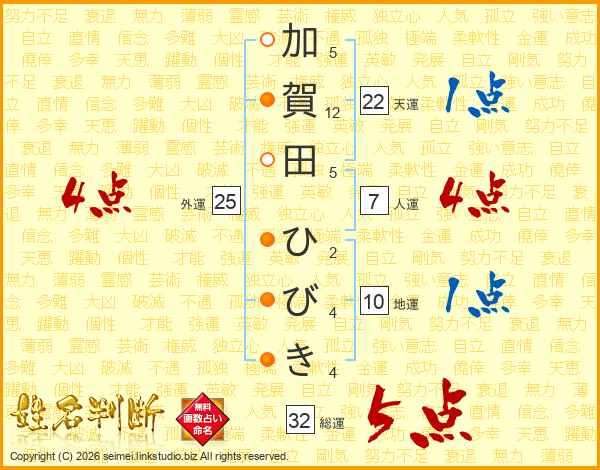 加賀田ひびきさんの総運は32画の5点!