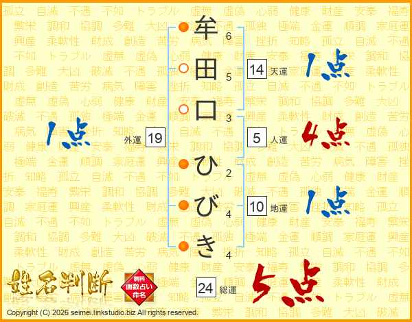 画数の奇数(○陽)と偶数(●陰)の配列で吉凶を占います。どちらかにかたよる名前は大凶名で避ける必要があります。画数の奇数偶数。