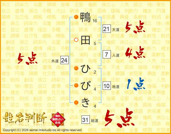鴨田ひびきさんの総運は31画の5点!