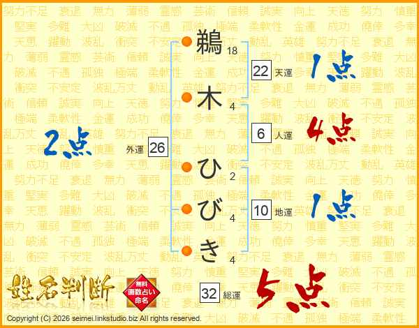 鵜(18画)木(4画) ひ(2画)び(4画)き(4画)