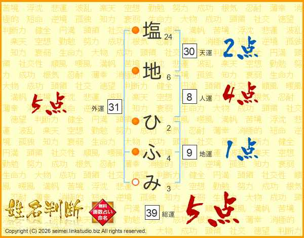 塩地ひふみさんの総運は39画の5点!